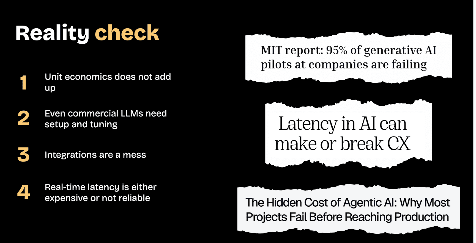 There’s a prevailing narrative that suggests AI agents are simple to deploy. Define a persona, connect a large language model, and launch within minutes! But in reality, most teams report the same problems once they move beyond pilots: latency is too high, costs spiral, integrations break, agents sound articulate but fail to complete the task that actually matters.